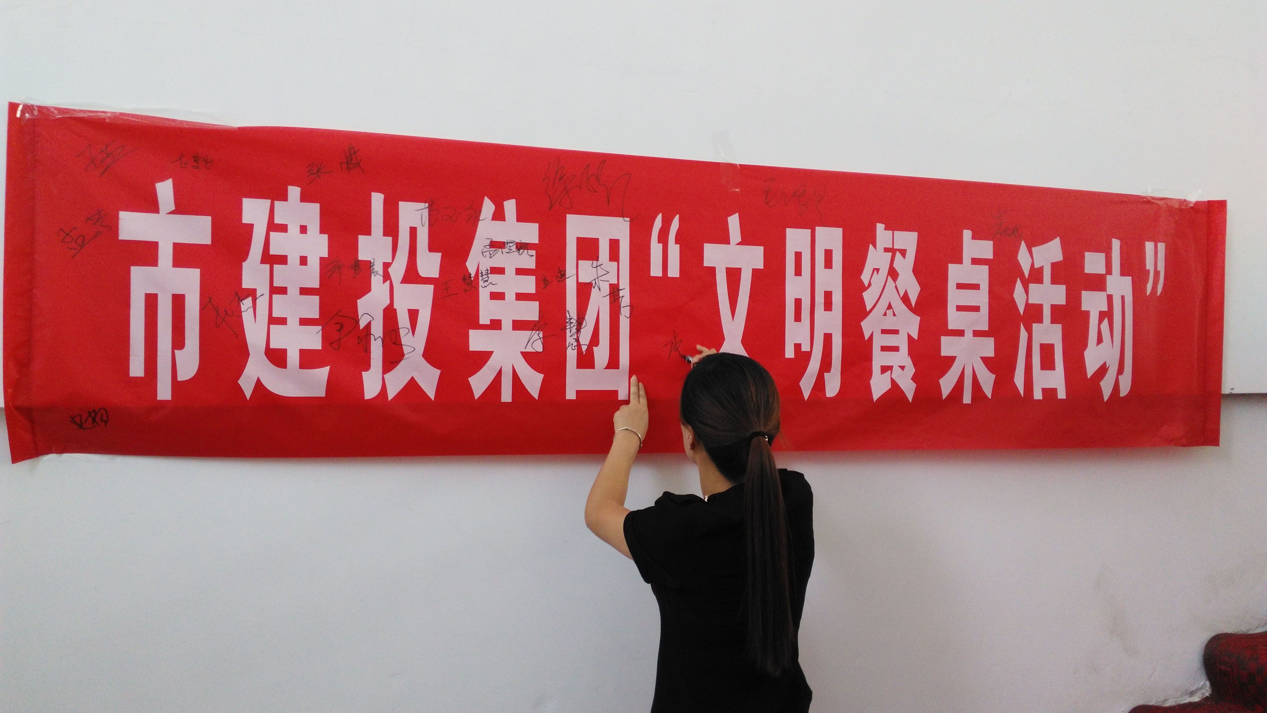 淮北市建投控股集團(tuán)有限公司開展以“文明就餐,從我做起”為主題的簽名活動。 同事們積極響應(yīng)倡議并在橫幅上簽字,把文明就餐真正落實到個人行為上,使節(jié)約真正成為自己的生活習(xí)慣。